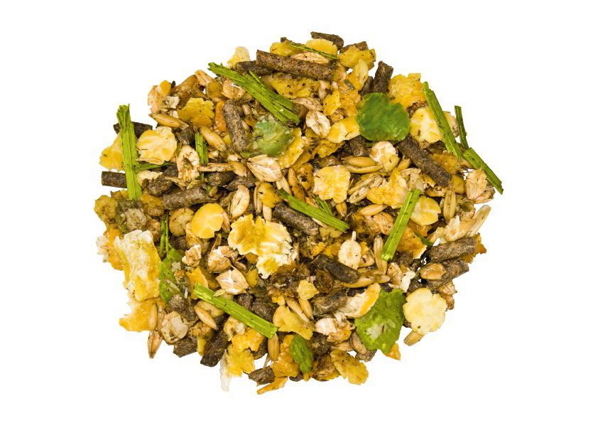 Flocons de maïs, Flocons de soja, Avoine (10,00 %), Flocons d‘orge, Son d‘avoine, Farine de blé fourrager, Mélasse de betterave sucrière, Semoule de son de blé, Pulpe de mélasse de betterave, Huile végétale de colza (4,00 %), Herbe, Séchée à haute température, Extraction guraux de soja, luzerne, Séchée à haute température, Huile végétale de colza (2,00 %), Carbonate de calcium, Flocons de pois, Gluten de maïs, Phosphate monocalcique, Chlorure de sodium, Chlorure de magnésium