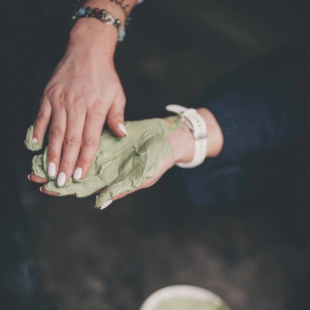Argile illite, argile kaolinite et argile montmorillonite, eau purifiée, huiles essentielles de menthe poivrée, gaulthérie odorante, lavande fine et lentisque pistachier.