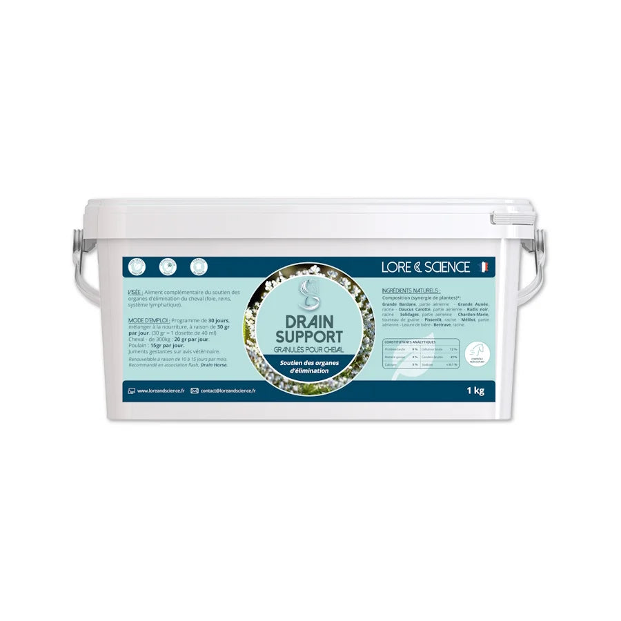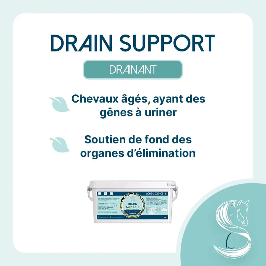 Aliment complémentaire, Drain Support (granulés) s’utilise en programme de fond et d’entretien destiné au soutien des organes d’élimination du cheval (foie, reins, pancréas…). Contient 7 plantes majeures concourant au soutien régulier des fonctions naturelles d’élimination