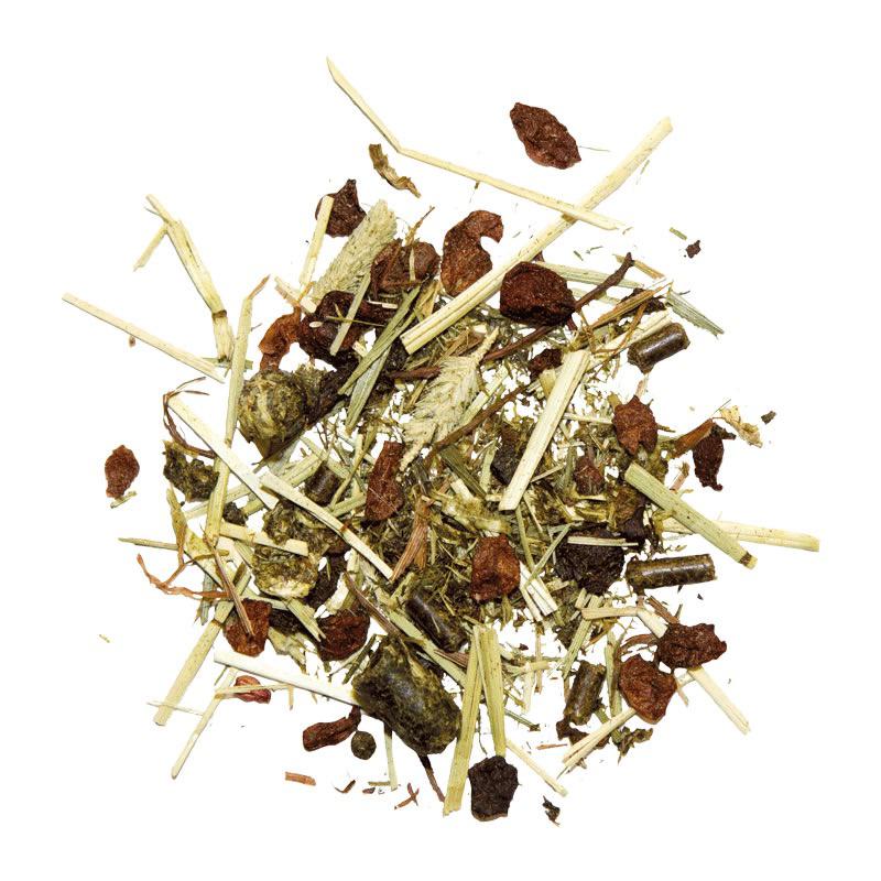 Herbe, séchée à haute température (48,00 %), marc de raisin (15,00 %), Extraction guraux de soja (14,00 %), Farine d‘extraction de graines de lin (10,50 %), Huile de colza raffinée (4,00 %), Herbe, séchée à haute température (Timothée) (3,00 %), Carbonate de calcium(1,00 %), Parois cellulaires de la levure de bière (1,00 %), Oxyde de magnésium (0,90 %), Bicarbonate de sodium (0,80 %), Phosphate monocalcique (0,50 %)