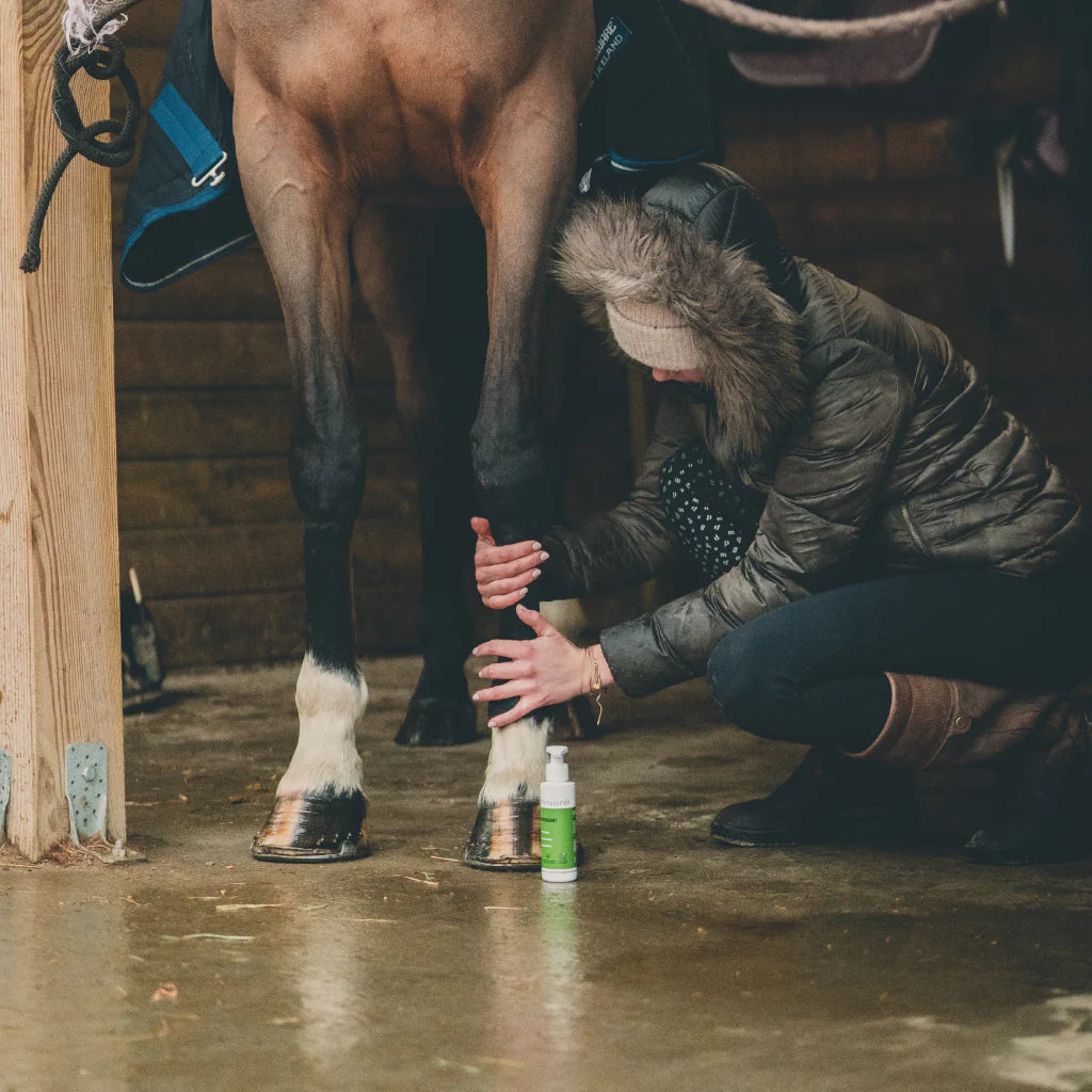 Appliqué en massage doux, il diffuse une sensation de fraîcheur immédiate qui participe à soulager les zones échauffées ou sensibilisées, tout en contribuant à limiter les réactions liées à un effort intense ou à un impact physique. Il peut être utilisé après une activité physique soutenue, lors de sollicitations inhabituelles, ou en présence d’une sensibilité localisée, notamment après un choc.L’action combinée de ces actifs naturels accompagne la stimulation de la microcirculation locale, aide au relâchement des tensions et favorise un retour progressif au confort musculaire. Son effet rafraîchissant, durable et bien toléré permet un usage répété, particulièrement sur les membres ou les masses musculaires.Sa texture légère et non grasse permet une application localisée, agréable et rapide, sans résidu collant. Très pénétrant, il facilite une absorption rapide de la formule, tout en étant bien toléré, y compris sur les peaux sensibles.Ce produit est particulièrement adapté aux chevaux ayant besoin d’un soutien après effort ou en cas de gêne ponctuelle liée à la mobilité.