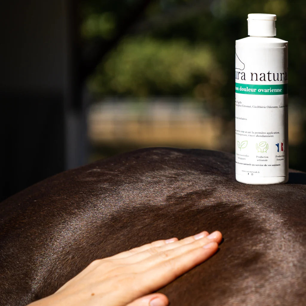 Appliquée en massage, elle participe à relâcher les tensions observées au niveau des flancs et de la zone pelvienne externe, tout en soutenant une sensation de confort pendant les phases sensibles. Elle peut être utilisée en période de chaleurs, lors de modifications de posture ou de comportement évocatrices d’un inconfort.