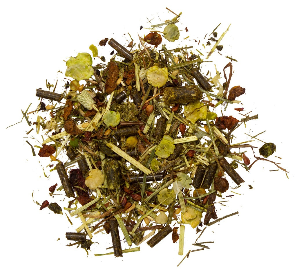 Herbe, séchée à haute température, flocons de pois, tourteau d' extraction de lin, marc de raisin séché, graines de lin décomposées, huile végétale (lin, chardon-marie), herbe, séchée à haute température (Timothée), protéines de pois, tourteau d' extraction de colza, graines de lin jaunes, Parois cellulaires de levure de bière (Saccharomyces cerevisiae), oxyde de magnésium, chlorure de sodium, acétate de magnésium, phosphate monocalcique, bicarbonate de sodium.