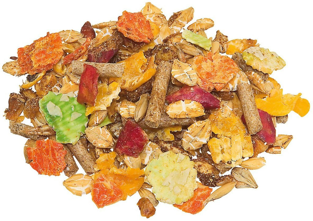 Flocons d‘orge (34,00 %), flocons de mais (27,00 %), avoine floconé (10,00 %), marc de raisin (6,00 %), graines de lin (5,00 %), mélasse de betterave (4,50 %), tourte de lin (3,00 %), levure de bière (3,00 %), flocons de pois (1,50 %), drêches de brasserie (1,20 %), flocons de carottes (1,00 %), herbe séchée à haute température (1,00 %), chlorure de sodium (0,60 %), farine d´algues marines (0,50 %), carbonate de calcium (0,5 %), monocalciumphosphate (0,3 %), oxide de magnésium (0,25 %)