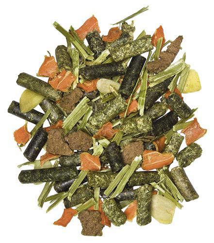 Herbe, séchée à haute température (82.00 %), huile végétale de colza (5,00 %), Luzerne, séchée à haute température (4,00 %), flocons de carottes (3,00 %), pommes séchées au marc de pomme (1,50 %), chlorure de sodium (0,90 %), carbonate de calcium (0,80 %), flocons d`ail (0,50 %), graine de lin (0,50 %), Phosphate monocalcique (0,50 %), oxyde de magnésium (0,30 %), levure de bière (0,25 %)